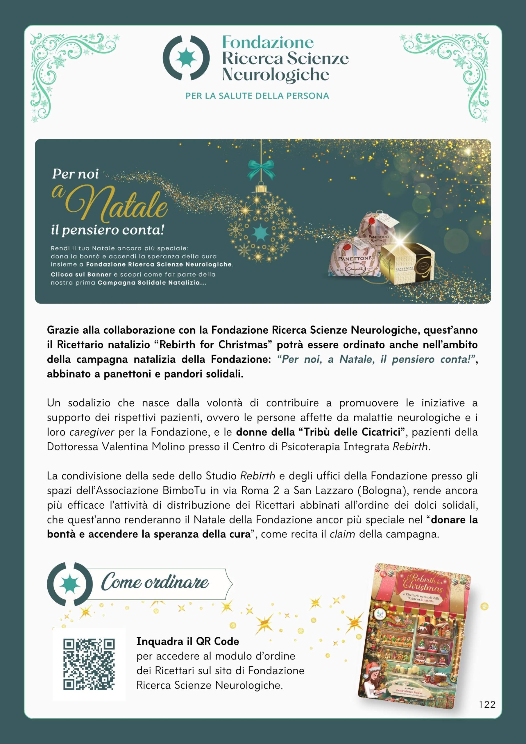 La Campagna Natalizia “Per noi, a Natale, il pensiero conta” della Fondazione Ricerca Scienze Neurologiche, e i Ricettari del Centro Rebirth, sono progetti realizzati in collaborazione con Teresa Dominijanni, Consulente per la comunicazione culturale e d’impresa – Telli: la consulenza creativa che va dritta al cuore.